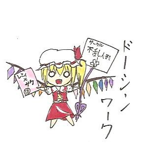 ▲フランドール・スカーレット。「ジ」の点々が、切れてるし……。 通称、妹様・フラン ところで、「妹様」って、「いもうとさま」って読むの?「いもさま」って読むの? ドージンワークって書こうと思ったらなんだか切れてるけど、 気がついたの今だからまぁいいや。こんな絵保存する人いないし。 最近、妹様もテーマ「U.N.オーエンは彼女なのか?」が、ドナルドネタにされているせいで かわいそうなフラン嬢ですが、自分は彼女に会ったことはありません。 理由はいくつかあります。 ①彼女はEXステージのボスなので通常ステージでは出てこない ②EXを出す条件は通常ステージノーコンティニュークリアなのでそれができない ③てか、自分が東方紅魔館を持っていない そろそろ、サークルについて考えを進めなければ……。
